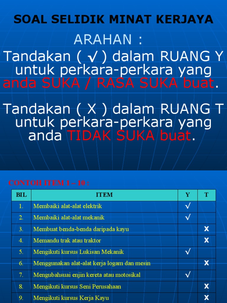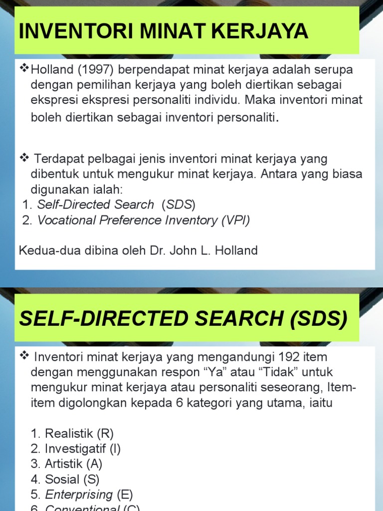Inventori Minat Kerjaya Holland - Inventori minat kerjaya vpi dapat mengenalpasti minat individu terhadap sesuatu bidang pekerjaan.. Tandakan aktiviti yang anda gemari atau yang anda ingin cuba. Inventori minat kerjaya vocational preference inventory. Inventori minat kerjaya by ubkktk 21123 views. Oleh itu dalam mengenalpasti minat terhadap kerjaya terdapat pelbagai alat ujian yang boleh menilai minat kerjaya kita. Inventori minat kerjaya vpi dapat mengenalpasti minat individu terhadap sesuatu bidang pekerjaan.