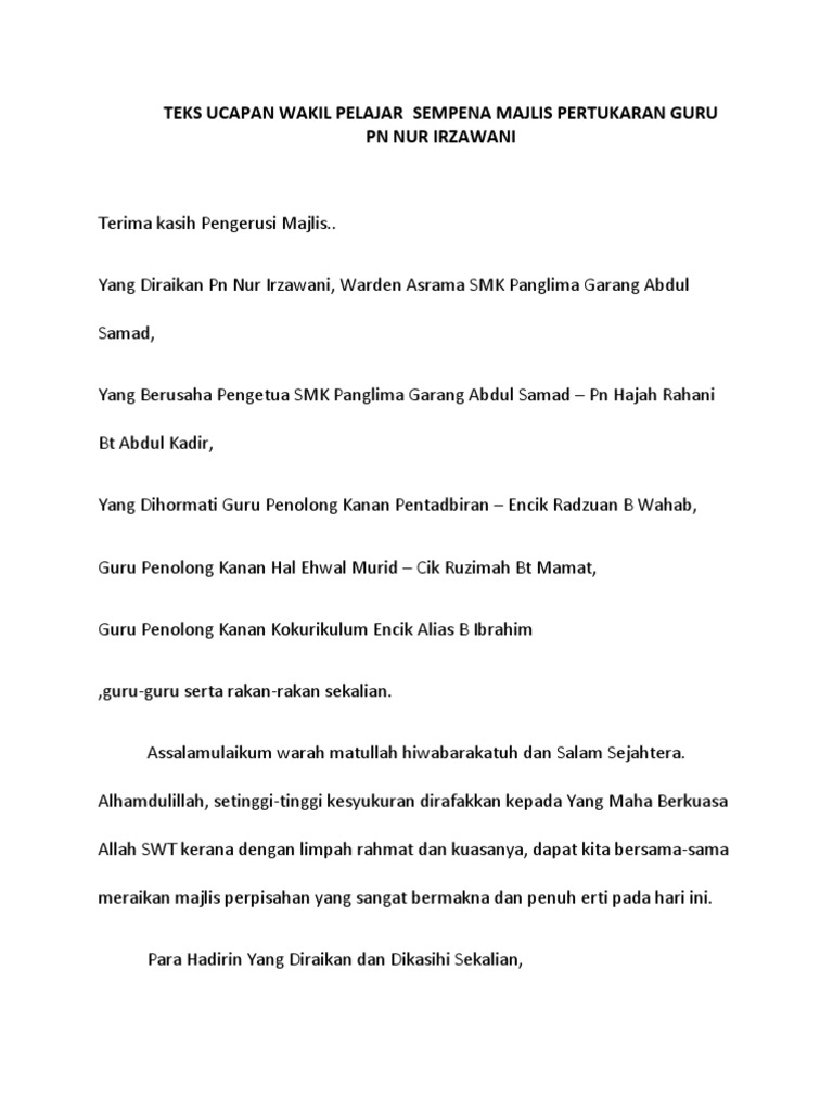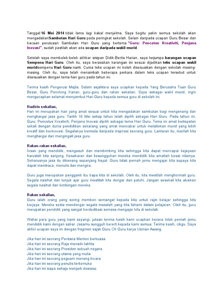 Contoh ucapan hari lahir, hari jadi, takziah, guru, perkahwinan, perpisahan, penghargaan, tahniah, doa selepas solat. Banyak antara kita yang ingin menyampaikan ucapan teri. Doc teks ucapan pengacara majlis sambutan hari guru dan pekerja sk. Dh karangpun kadang akan ada kena ubah di saat akhir. Ucapan daripada wakil pelajar smk bukit besar.