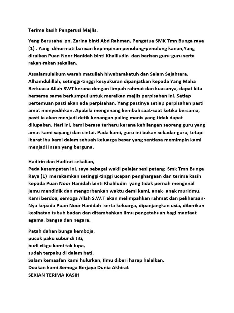 Doc teks ucapan pengacara majlis sambutan hari guru dan pekerja sk. Terima kasihkepada saudari pengerusi majlis. Sambutan dari wakil calon mempelai pria sekaligus. Akhir sekali, ucapan tahniah dan ribuan terima kasih juga kepada warga kerja bahagian pentadbiran & kewangan dan juga semua warga jabatan. Teks pembawa acara pengajian, pernikahan, acara resmi, peringatan hut ri.