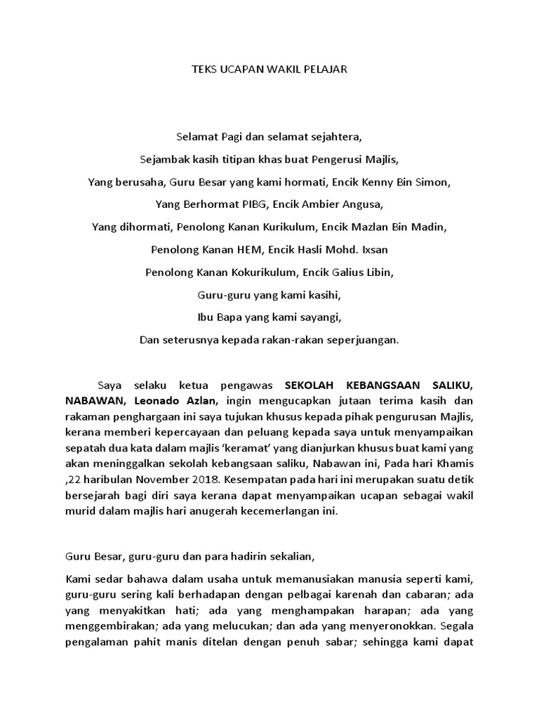 Ucapan Ketua Pengawas from image.slidesharecdn.com Teks ucapan ketua pelajar sempena hari guru mp3 & mp4. Pengerusi puspanita jajahan gua musang. Teks ucapan wakil murid sempena majlis persaraan guru. Doc teks ucapan wakil pelajar nurul izzah hazirah ii academia edu. Teks ucapan wakil pelajar sempena sambutan hari gurubismilahhirahmanirahim. Doc teks ucapan pengacara majlis sambutan hari guru dan pekerja sk. Ucapan wakil pelajar spm (restu ilmu 2020), saudari fatin nabilah binti zulkaria. Assalamualaikum w.r.b.t dan selamat pagi.