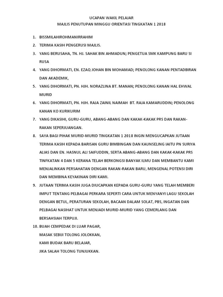 Ucapan Wakil Pelajar from cdn.slidesharecdn.com .wakil pelajar sma lughatul quran untuk menyampaikan ucapannya. Doc teks ucapan pengacara majlis sambutan hari guru dan pekerja sk. Sangat bagus untuk tugas seperti membaca bahagian teks yang panjang. Teks ucapan ketua pelajar sempena hari guru mp3 & mp4. Contoh ucapan hari lahir, hari jadi, takziah, guru, perkahwinan, perpisahan, penghargaan, tahniah, doa selepas solat. Teks ucapan ketua pengawas hari graduasi. Teks ucapan wakil murid sempena majlis persaraan guru. Berbagai ucapan selamat wisuda ✅ singkat dan lucu dalam bahasa inggris, indonesia, sunda, dan islam untuk sahabat, teman, pacar yang wisuda.